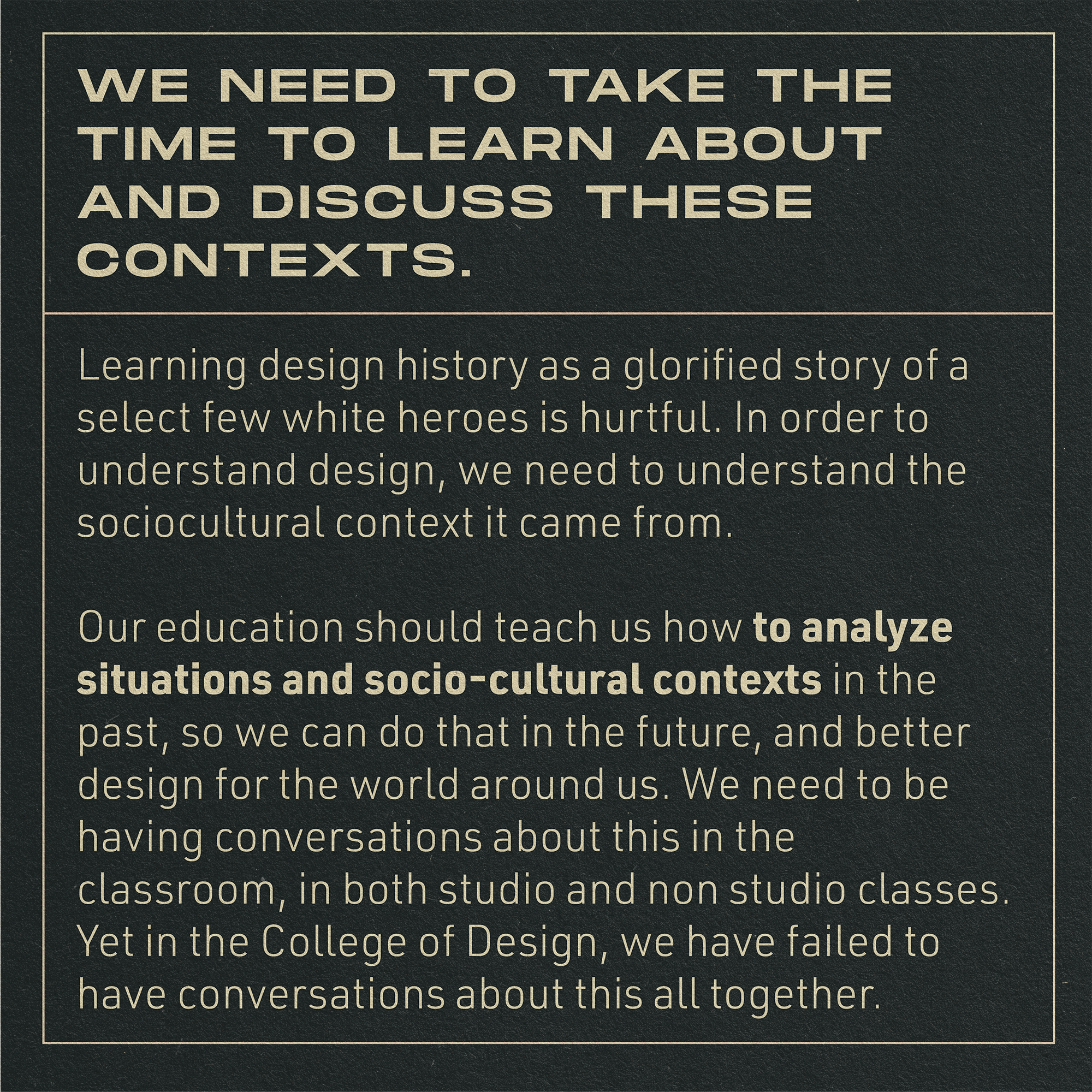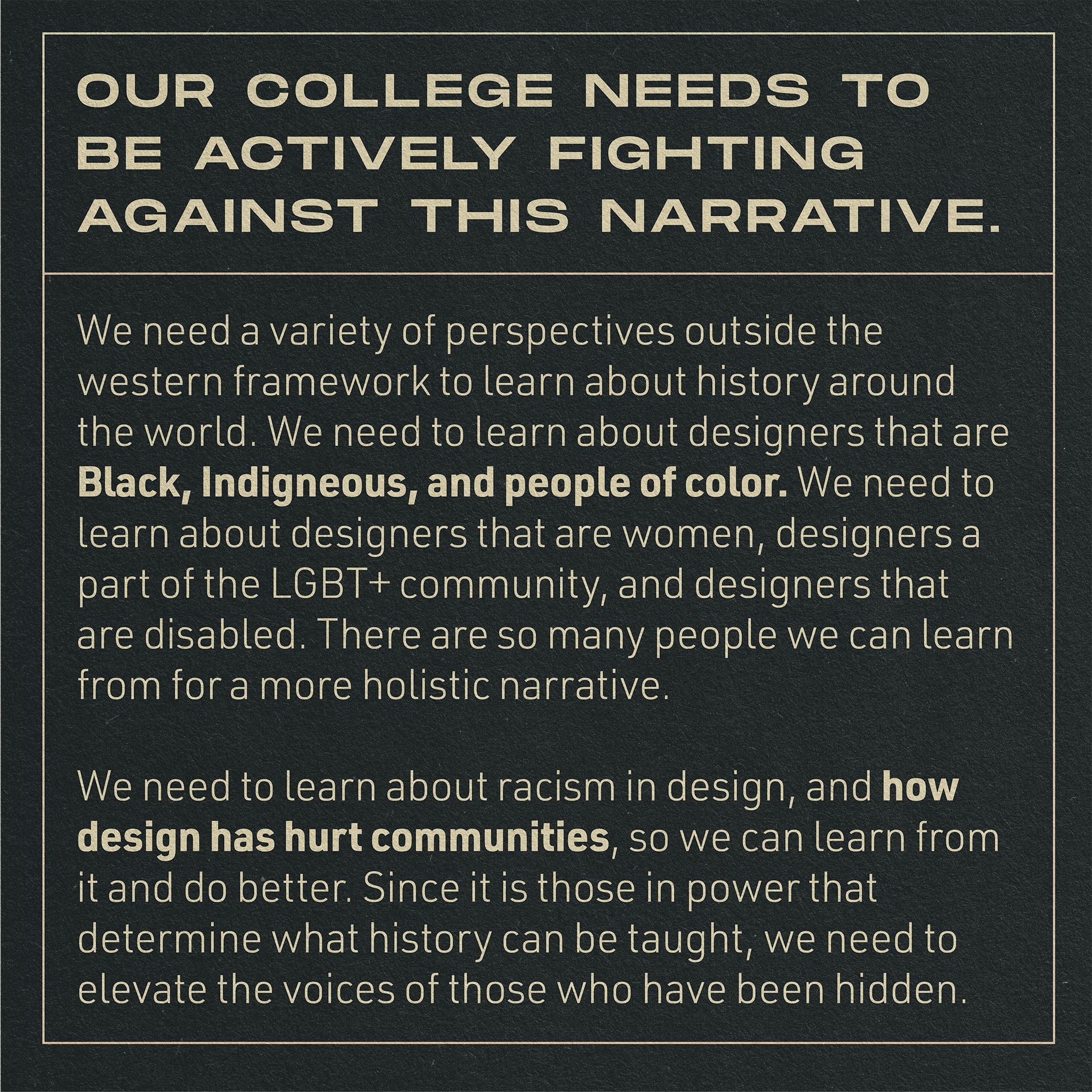Sent demands to faculty to incorporate more BIPOC design into our education. We emphasized the importance of social sciences and critical theory in design, and shared educational information regarding BIPOC design history and decolonizing design.